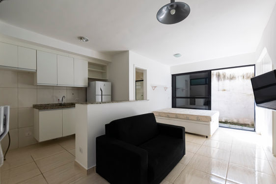 Studio totalmente mobiliado em condomínio exclusivo com fogão, geladeira, Televisão, cama, sofá cama, armários embutidos, gabinetes no banheiro e cozinha, bistrô com banquetas para almoço.